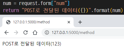 GET에서 보냈던 num이라는 데이터를 받아 보면 request.form["num"] 이렇게 쓰고 이 값은 123이라는 결과가 나올거에요.